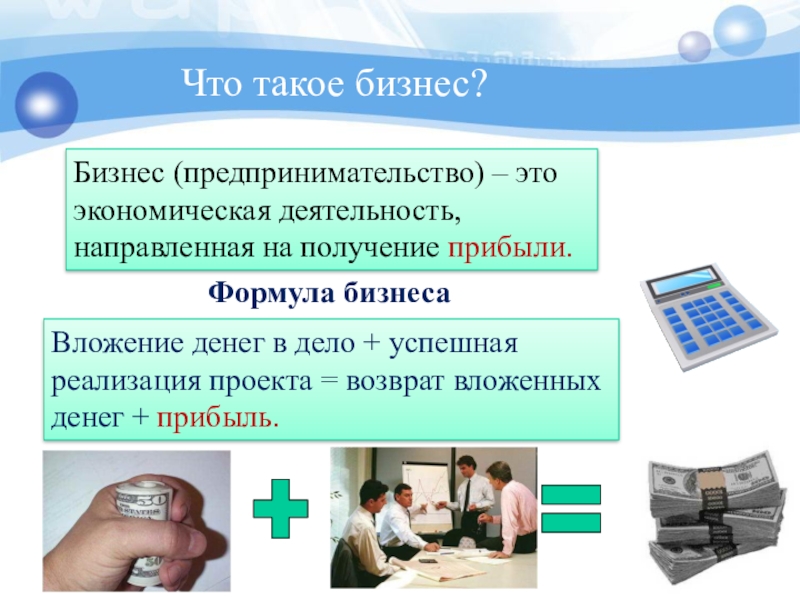 Вложение денег в дело + успешная реализация проекта = возврат вложенных денег + прибыль.