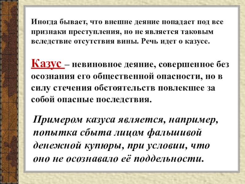 Иногда бывает, что внешне деяние попадает под все признаки преступления, но не является таковым вследствие отсутствия вины. Речь идет о казусе.