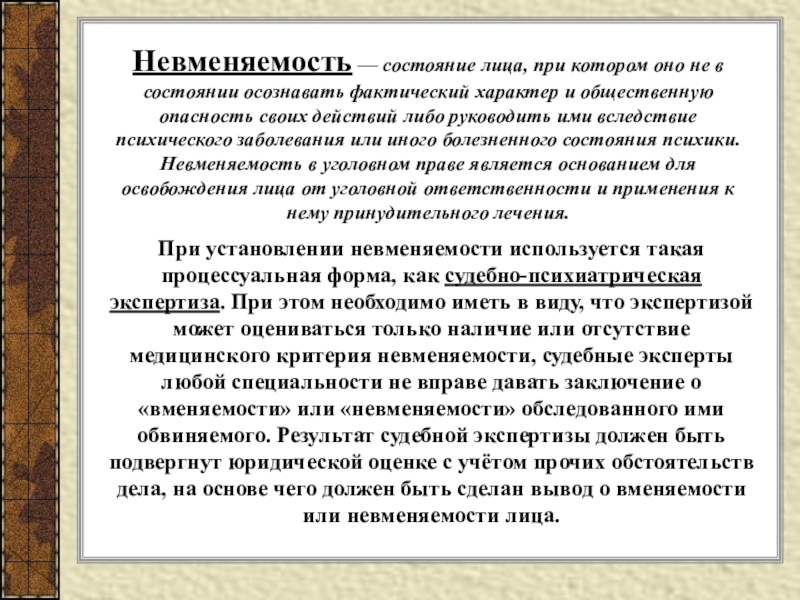 При установлении невменяемости используется такая процессуальная форма, как судебно-психиатрическая экспертиза. При этом необходимо иметь в виду, что экспертизой может оцениваться только наличие или отсутствие медицинского критерия невменяемости, судебные эксперты любой специальности не вправе давать заключение о «вменяемости» или «невменяемости» обследованного ими обвиняемого. Результат судебной экспертизы должен быть подвергнут юридической оценке с учётом прочих обстоятельств дела, на основе чего должен быть сделан вывод о вменяемости или невменяемости лица.