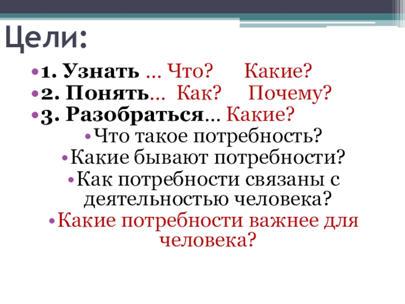 Цели:1. Узнать … Что?   Какие?2. Понять… Как?   Почему?3. Разобраться… Какие?Что такое потребность?Какие бывают