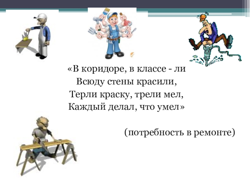«В коридоре, в классе - лиВсюду стены красили,Терли краску, трели мел,Каждый делал, что умел»(потребность в ремонте)