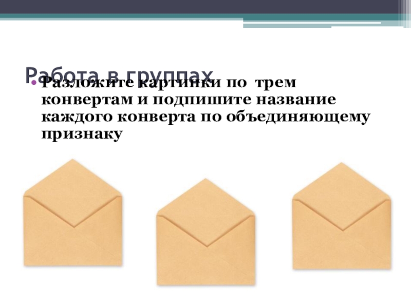 Работа в группахРазложите картинки по трем конвертам и подпишите название каждого конверта по объединяющему признаку