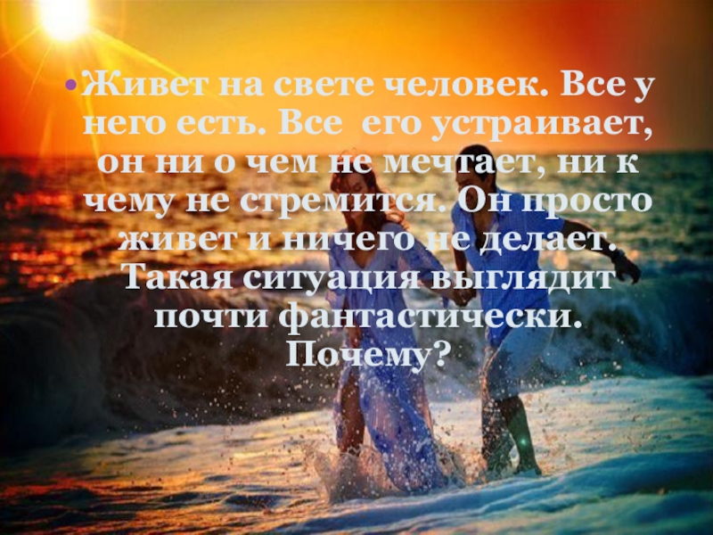 Слайд 8Живет на свете человек. Все у него есть. Все его устраивает,