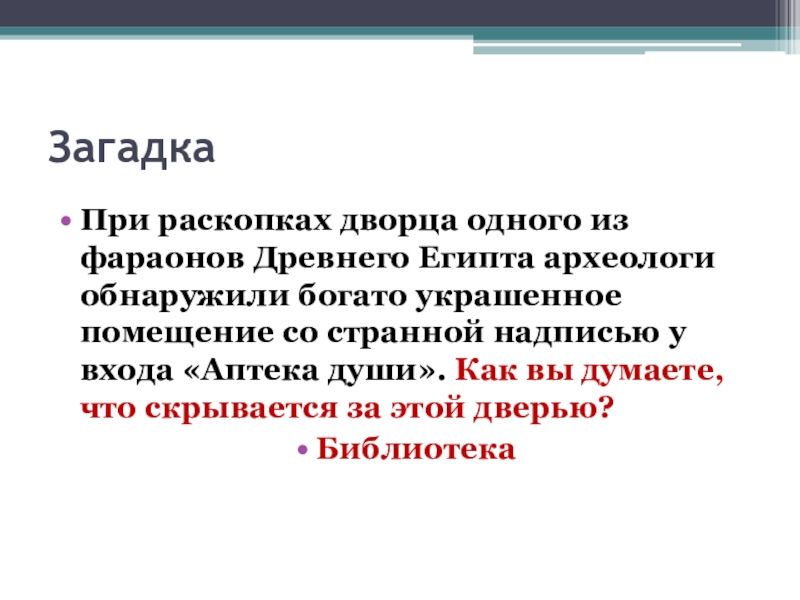 ЗагадкаПри раскопках дворца одного из фараонов Древнего Египта археологи обнаружили богато украшенное помещение со странной надписью у