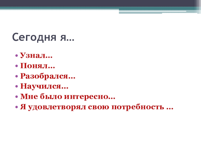 Сегодня я…Узнал…Понял…Разобрался…Научился…Мне было интересно…Я удовлетворял свою потребность …