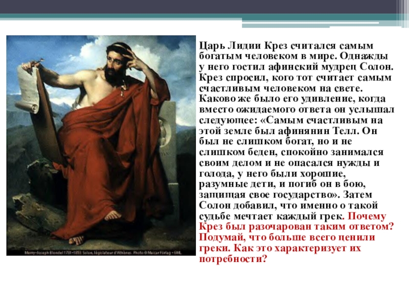 Однажды у него гостил афинский мудрец Солон. Крез спросил, кого тот считает самым счастливым человеком на свете. Каково же было его удивление, когда вместо ожидаемого ответа он услышал следующее: «Самым счастливым на этой земле был афинянин Телл. Он был не слишком богат, но и не слишком беден, спокойно занимался своим делом и не опасался нужды и голода, у него были хорошие, разумные дети, и погиб он в бою, защищая свое государство». Затем Солон добавил, что именно о такой судьбе мечтает каждый грек. Почему Крез был разочарован таким ответом? Подумай, что больше всего ценили греки. Как это характеризует их потребности?