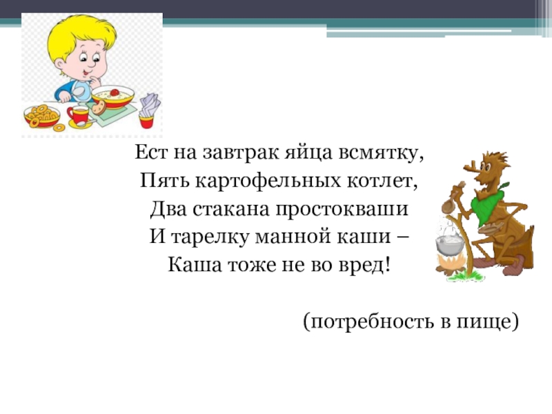 Ест на завтрак яйца всмятку,Пять картофельных котлет,Два стакана простоквашиИ тарелку манной каши – Каша тоже не во