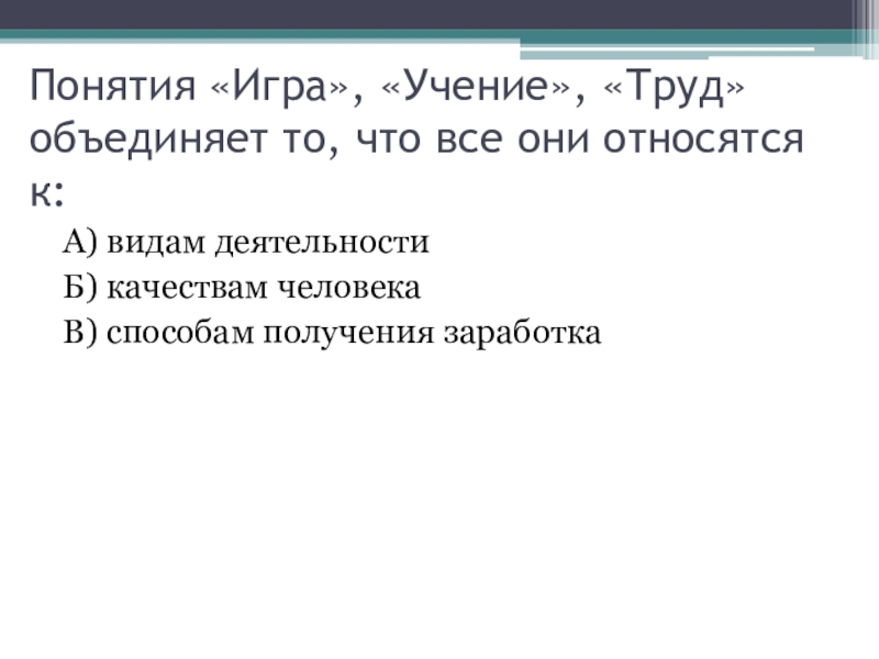 Понятия «Игра», «Учение», «Труд» объединяет то, что все они относятся к:А) видам деятельностиБ) качествам человекаВ) способам получения