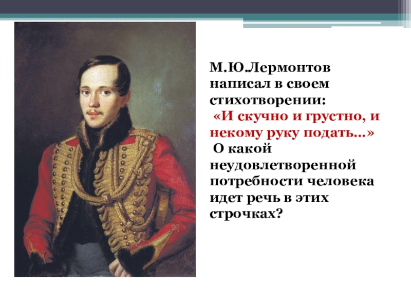 М.Ю.Лермонтов написал в своем стихотворении: «И скучно и грустно, и некому руку подать…» О какой неудовлетворенной потребности