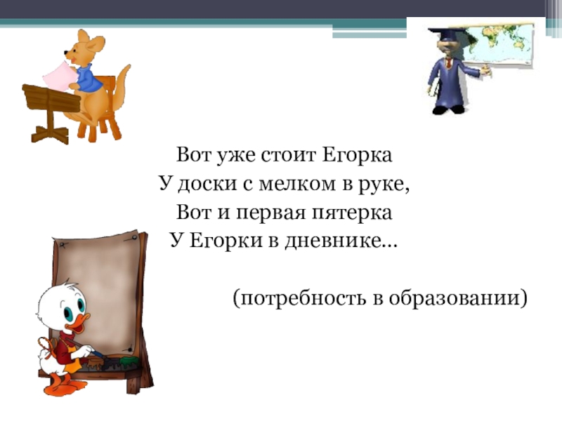 Вот уже стоит ЕгоркаУ доски с мелком в руке,Вот и первая пятеркаУ Егорки в дневнике…(потребность в образовании)