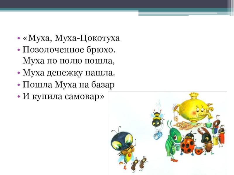 «Муха, Муха-ЦокотухаПозолоченное брюхо. Муха по полю пошла,Муха денежку нашла.Пошла Муха на базарИ купила самовар»