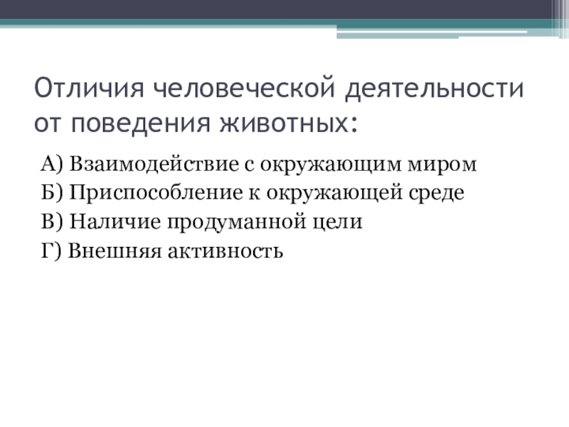 Отличия человеческой деятельности от поведения животных:А) Взаимодействие с окружающим миромБ) Приспособление к окружающей средеВ) Наличие продуманной целиГ)