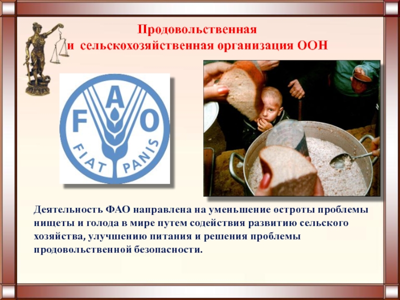 нищеты и голода в мире путем содействия развитию сельского хозяйства, улучшению питания и решения проблемы продовольственной безопасности.