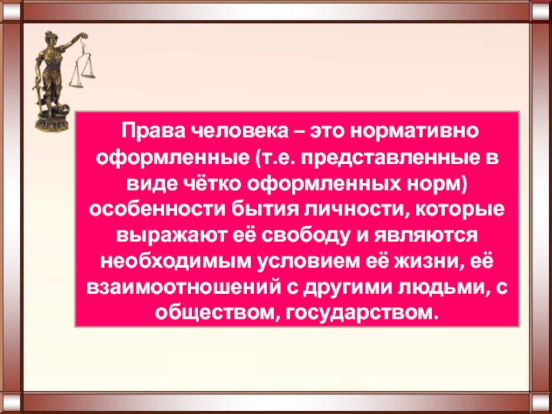 Слайд 2 Права человека – это нормативно оформленные (т.е. представленные в виде чётко