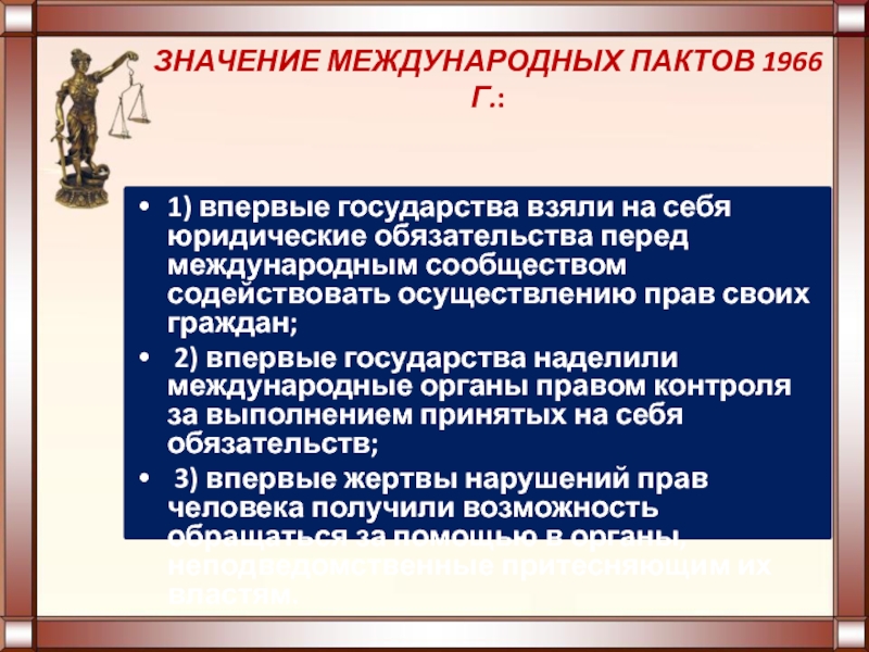 Слайд 7ЗНАЧЕНИЕ МЕЖДУНАРОДНЫХ ПАКТОВ 1966 Г.:
