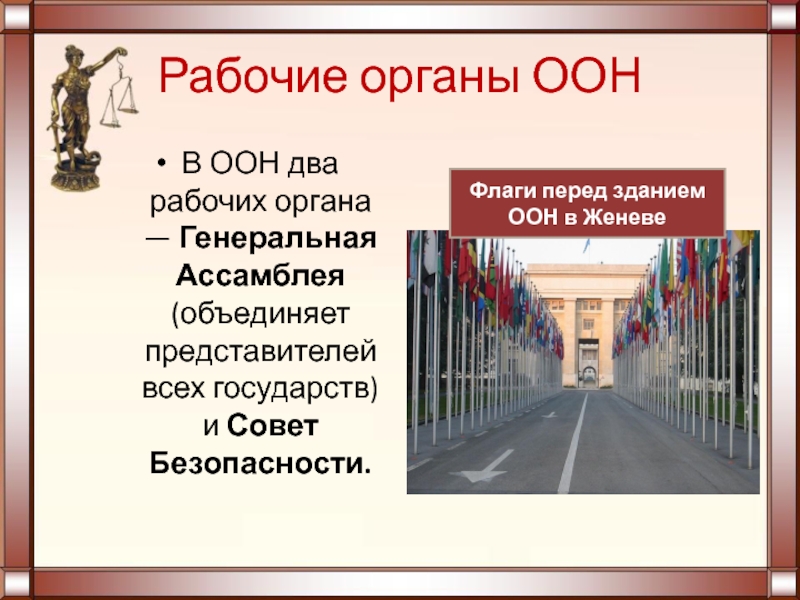 В ООН два рабочих органа — Генеральная Ассамблея (объединяет