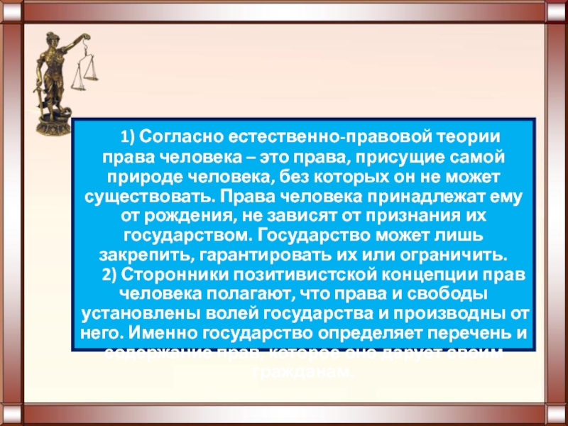 Слайд 3 1) Согласно естественно-правовой теории права человека – это права, присущие