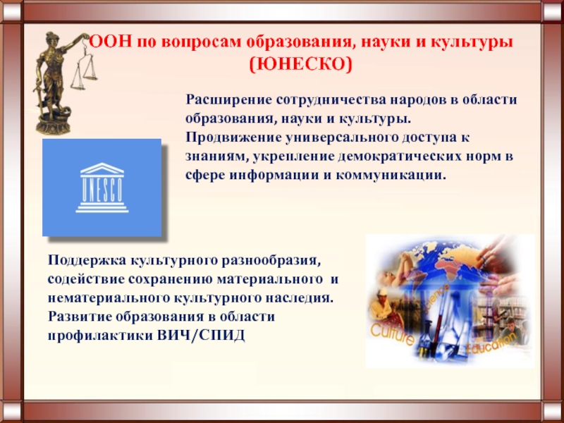 Слайд 32ООН по вопросам образования, науки и культуры (ЮНЕСКО)