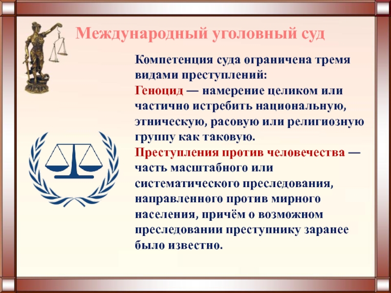 Преступления против человечества — часть масштабного или систематического преследования, направленного против мирного населения, причём о возможном преследовании преступнику заранее было известно.