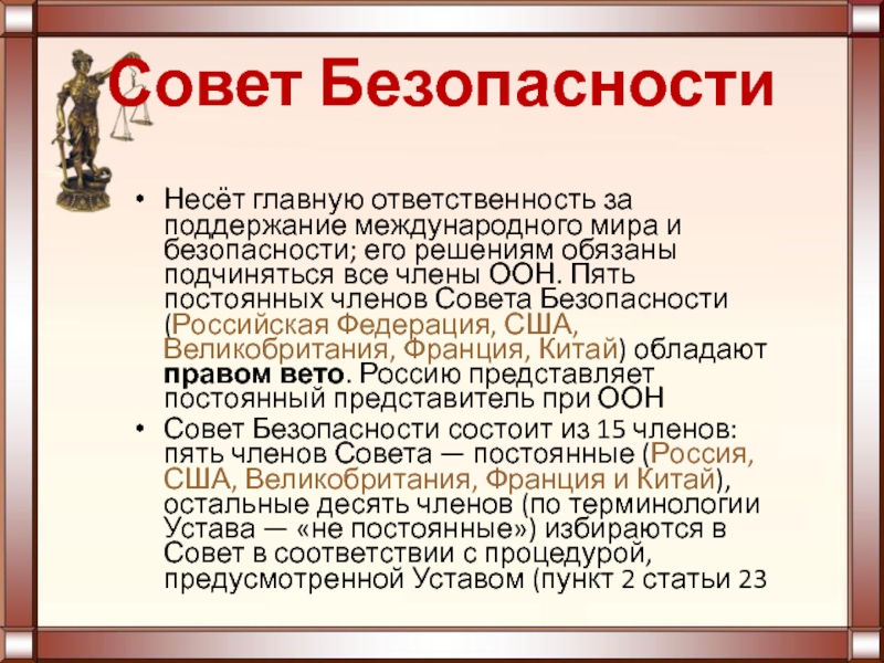 решениям обязаны подчиняться все члены ООН. Пять постоянных членов Совета Безопасности (Российская Федерация, США, Великобритания, Франция, Китай) обладают правом вето. Россию представляет постоянный представитель при ООН