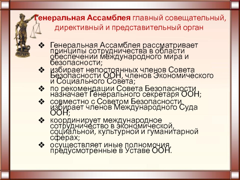 Слайд 16Генеральная Ассамблея главный совещательный, директивный и представительный орган