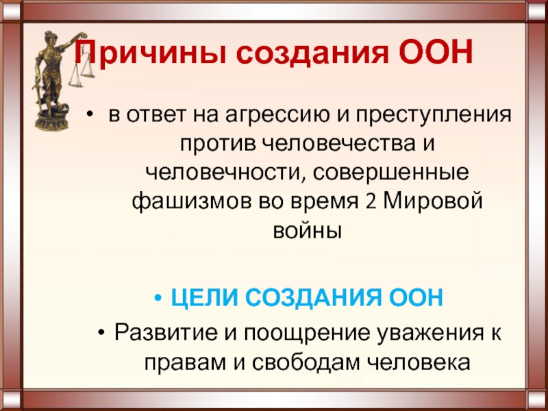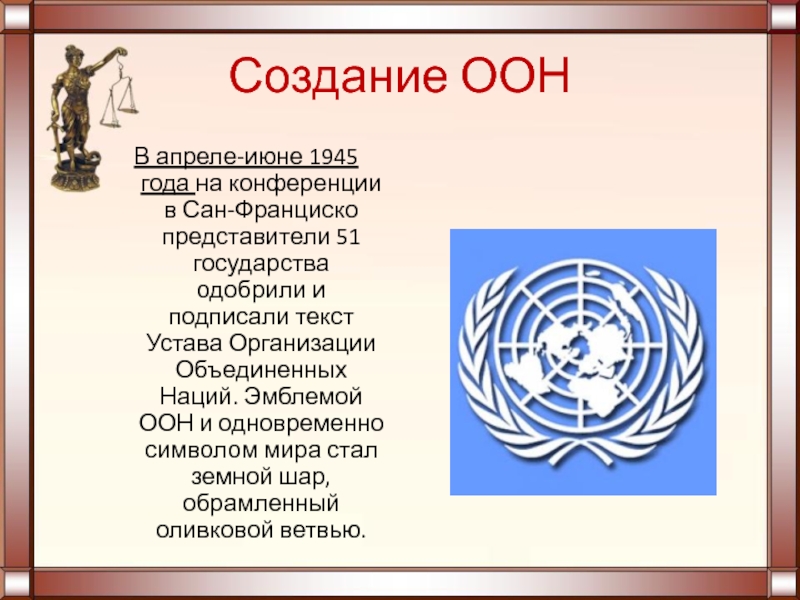 государства одобрили и подписали текст Устава Организации Объединенных Наций. Эмблемой ООН и одновременно символом мира стал земной шар, обрамленный оливковой ветвью.