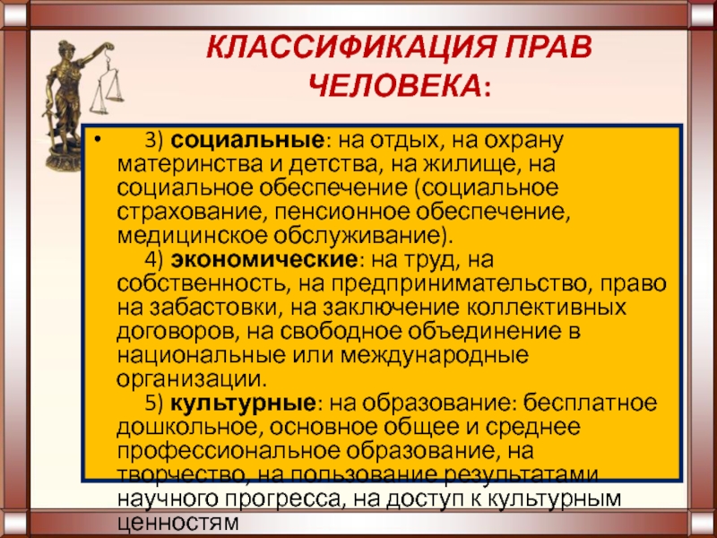Слайд 4КЛАССИФИКАЦИЯ ПРАВ ЧЕЛОВЕКА: