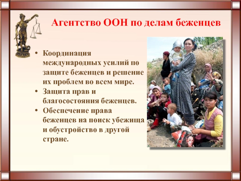 Обеспечение права беженцев на поиск убежища и обустройство в другой стране.