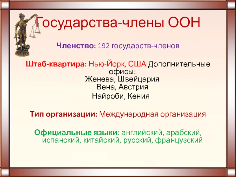 Официальные языки: английский, арабский, испанский, китайский, русский, французский