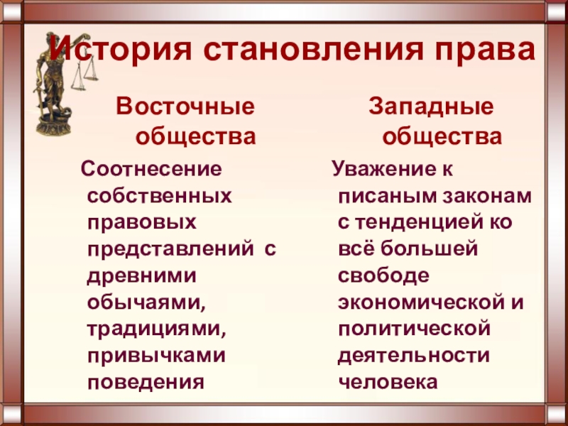 Уважение к писаным законам с тенденцией ко всё большей свободе экономической и политической деятельности человека