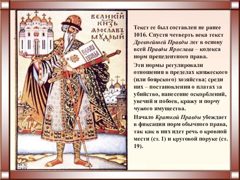 Древнейшей Правды лег в основу всей Правды Ярослава – кодекса норм прецедентного права.