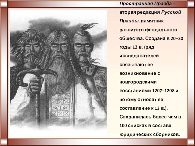 Слайд 12Пространная Правда – вторая редакция Русской Правды, памятник развитого феодального общества.