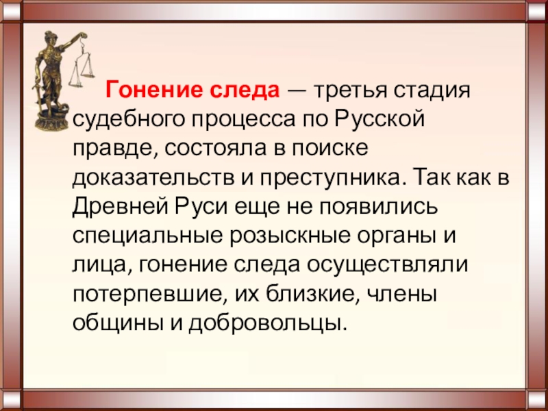 Русской правде, состояла в поиске доказательств и преступника. Так как в Древней Руси еще не появились специальные розыскные органы и лица, гонение следа осуществляли потерпевшие, их близкие, члены общины и добровольцы.