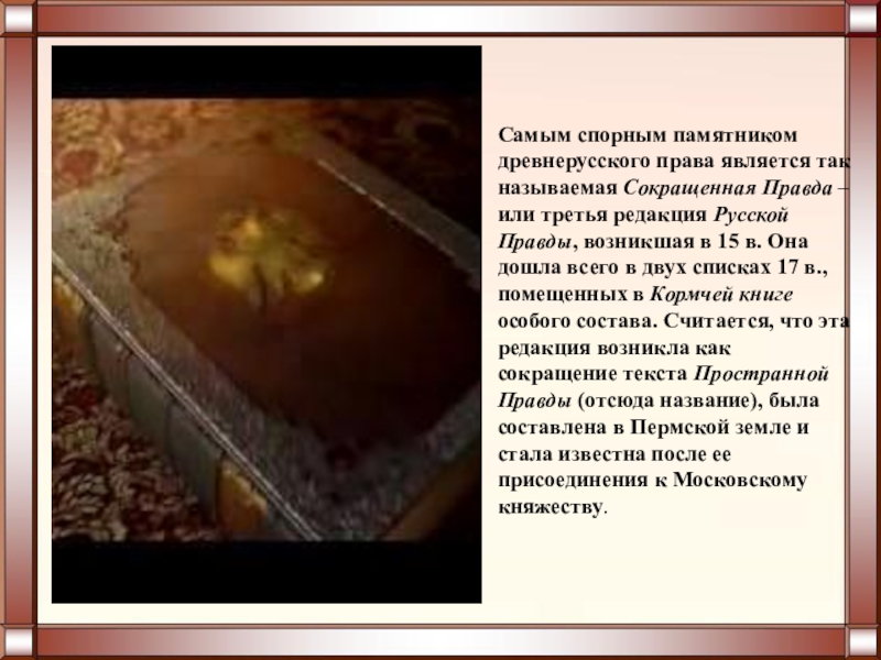 Слайд 13Самым спорным памятником древнерусского права является так называемая Сокращенная Правда –