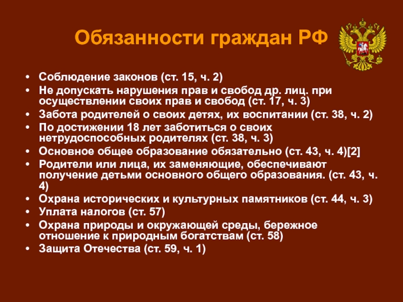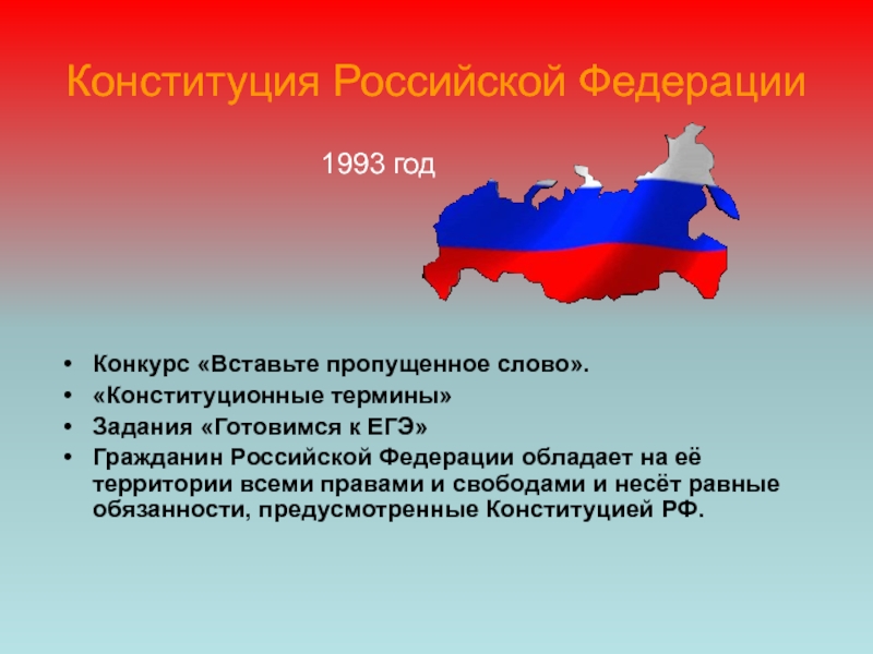 обладает на её территории всеми правами и свободами и несёт равные обязанности, предусмотренные Конституцией РФ.