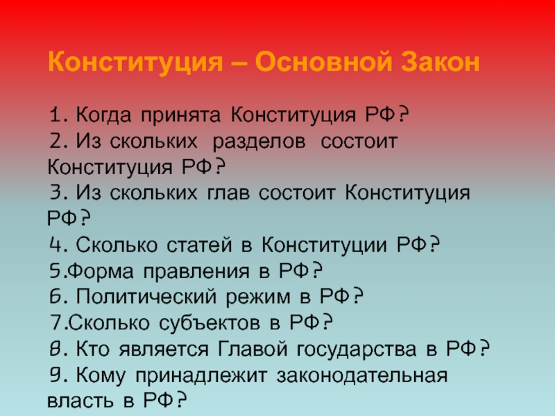 Конституция СССР 1977 г. Основной Закон 1977 года впервые вводит понятие "народ". Особое значение отводится Коммунистической партии, закрепляя за ней право на политическое руководство государственными и общественными организациями, направлять и координировать их деятельность. Закреплены права граждан: право человека на труд и на отдых, право на охрану здоровья, на жилище, неприкосновенность личности, право на получение всеобщего обязательного среднего образования, право на материальное обеспечение, гарантия свободы совести, запрет возбуждения вражды и ненависти в связи с религиозными убеждениями.