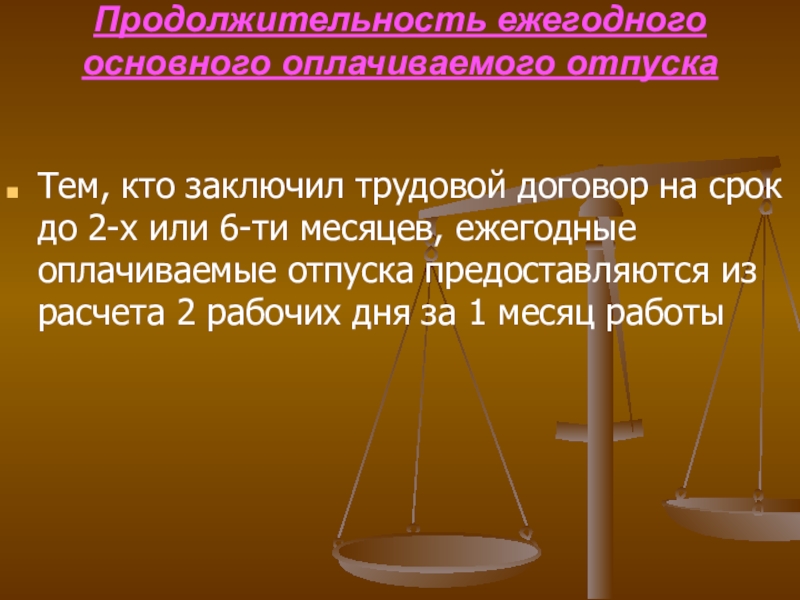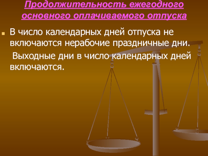 Слайд 18Продолжительность ежегодного основного оплачиваемого отпуска