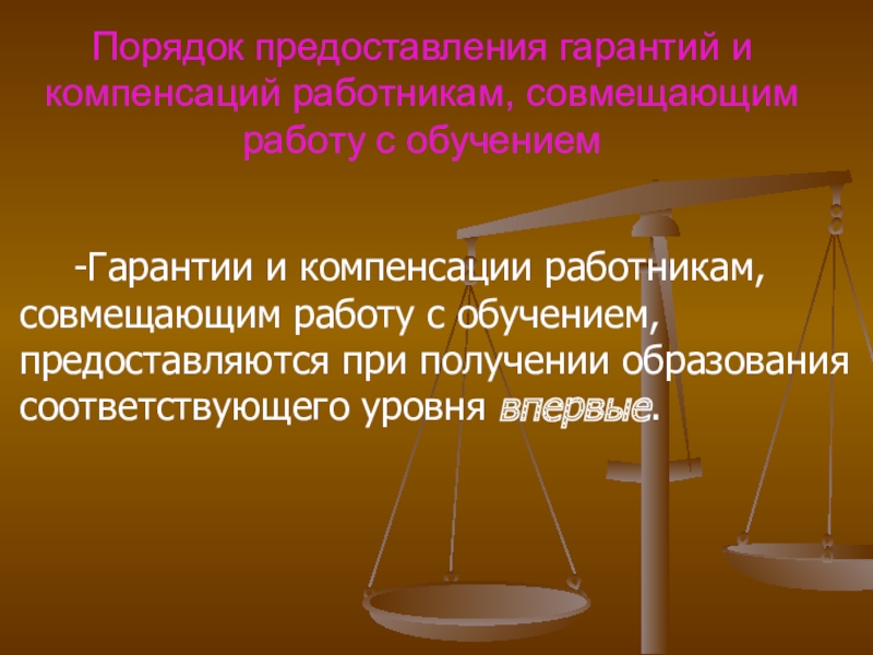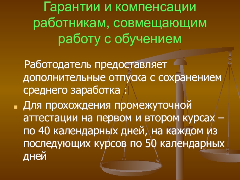 Слайд 47Гарантии и компенсации работникам, совмещающим работу с обучением