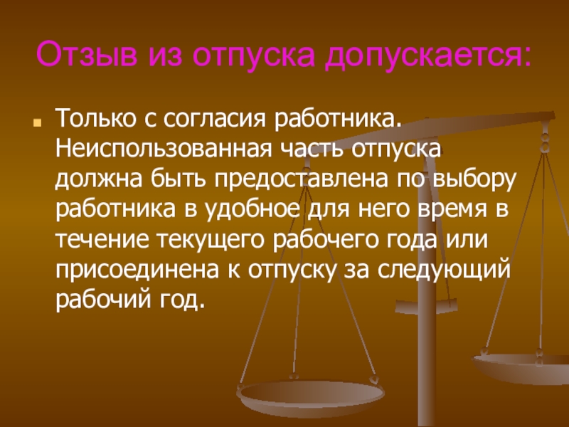 Слайд 30Отзыв из отпуска допускается: