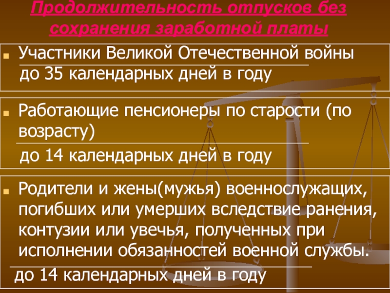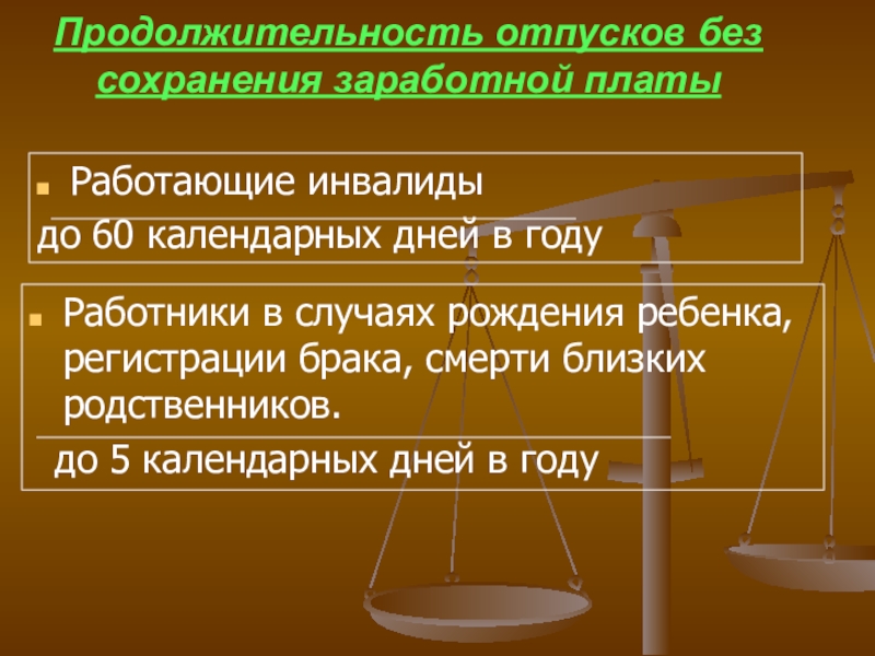 Слайд 39Продолжительность отпусков без сохранения заработной платы