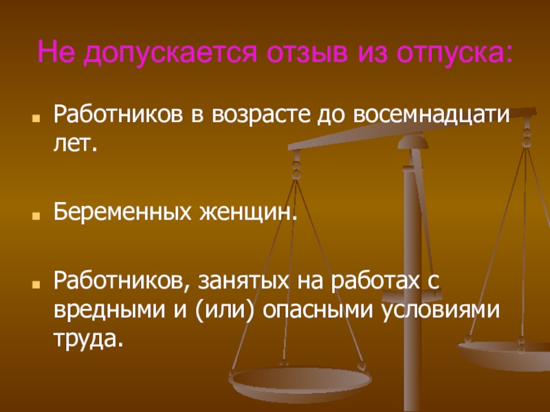 Слайд 31Не допускается отзыв из отпуска: