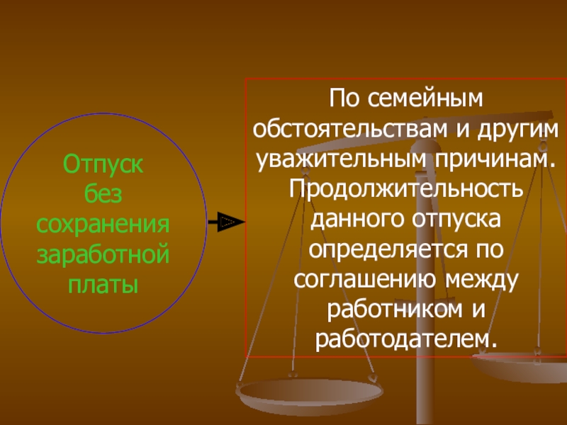 Слайд 37По семейным обстоятельствам и другим уважительным причинам. Продолжительность данного отпуска определяется