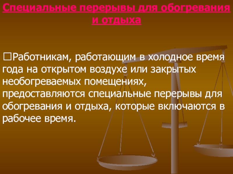 Слайд 6Специальные перерывы для обогревания и отдыха