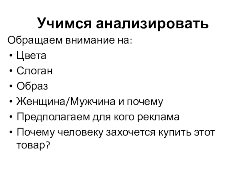 Учимся анализироватьОбращаем внимание на: ЦветаСлоганОбразЖенщина/Мужчина и почемуПредполагаем для кого рекламаПочему человеку захочется купить этот товар?