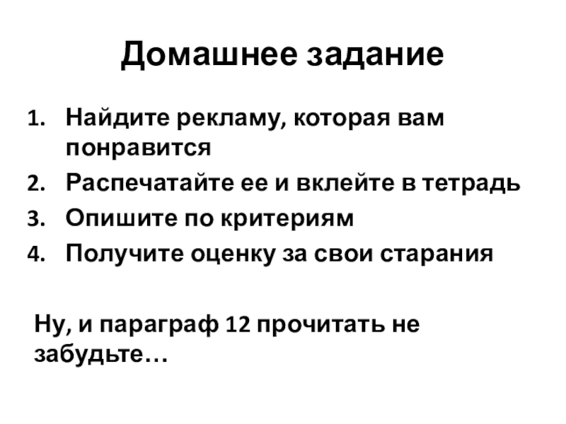 Домашнее заданиеНайдите рекламу, которая вам понравитсяРаспечатайте ее и вклейте в тетрадьОпишите по критериямПолучите оценку за свои старанияНу,
