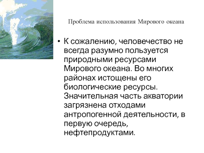 природными ресурсами Мирового океана. Во многих районах истощены его биологические ресурсы. Значительная часть акватории загрязнена отходами антропогенной деятельности, в первую очередь, нефтепродуктами.