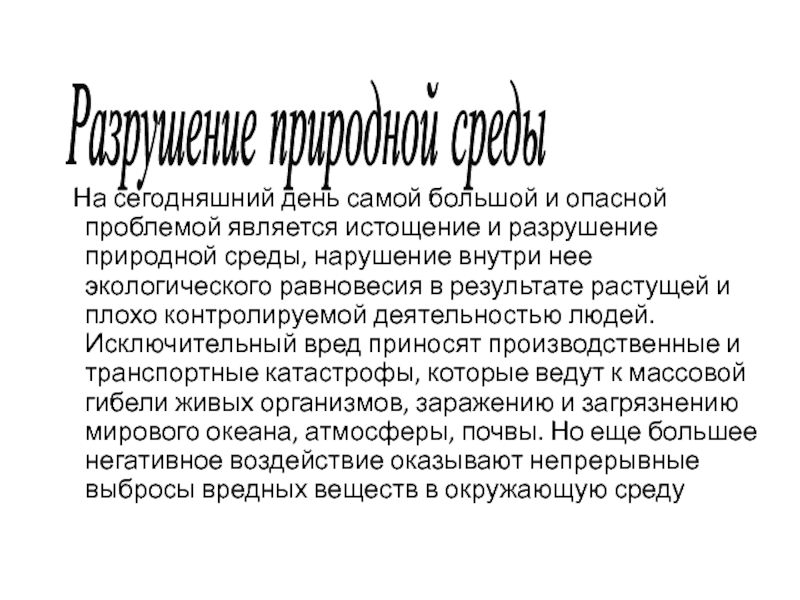 истощение и разрушение природной среды, нарушение внутри нее экологического равновесия в результате растущей и плохо контролируемой деятельностью людей. Исключительный вред приносят производственные и транспортные катастрофы, которые ведут к массовой гибели живых организмов, заражению и загрязнению мирового океана, атмосферы, почвы. Но еще большее негативное воздействие оказывают непрерывные выбросы вредных веществ в окружающую среду