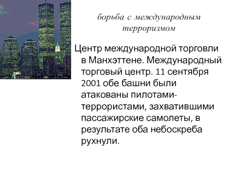 центр. 11 сентября 2001 обе башни были атакованы пилотами-террористами, захватившими пассажирские самолеты, в результате оба небоскреба рухнули.