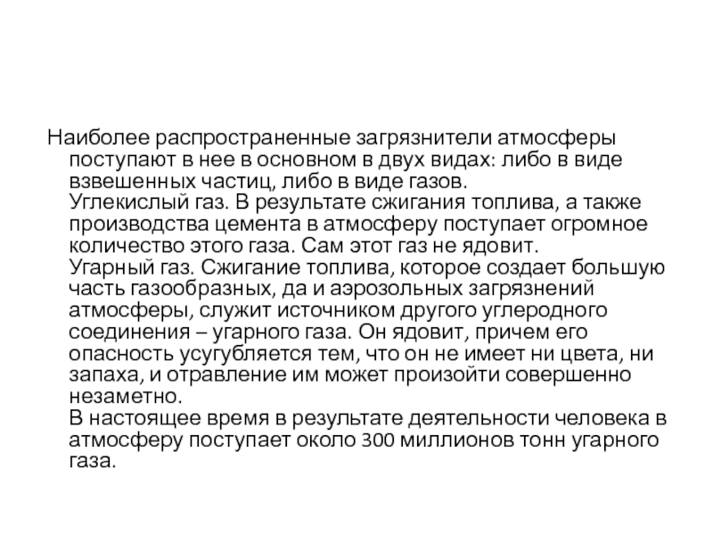 В настоящее время в результате деятельности человека в атмосферу поступает около 300 миллионов тонн угарного газа.