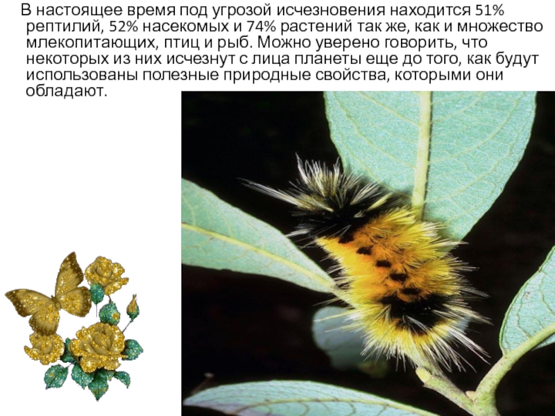 52% насекомых и 74% растений так же, как и множество млекопитающих, птиц и рыб. Можно уверено говорить, что некоторых из них исчезнут с лица планеты еще до того, как будут использованы полезные природные свойства, которыми они обладают.